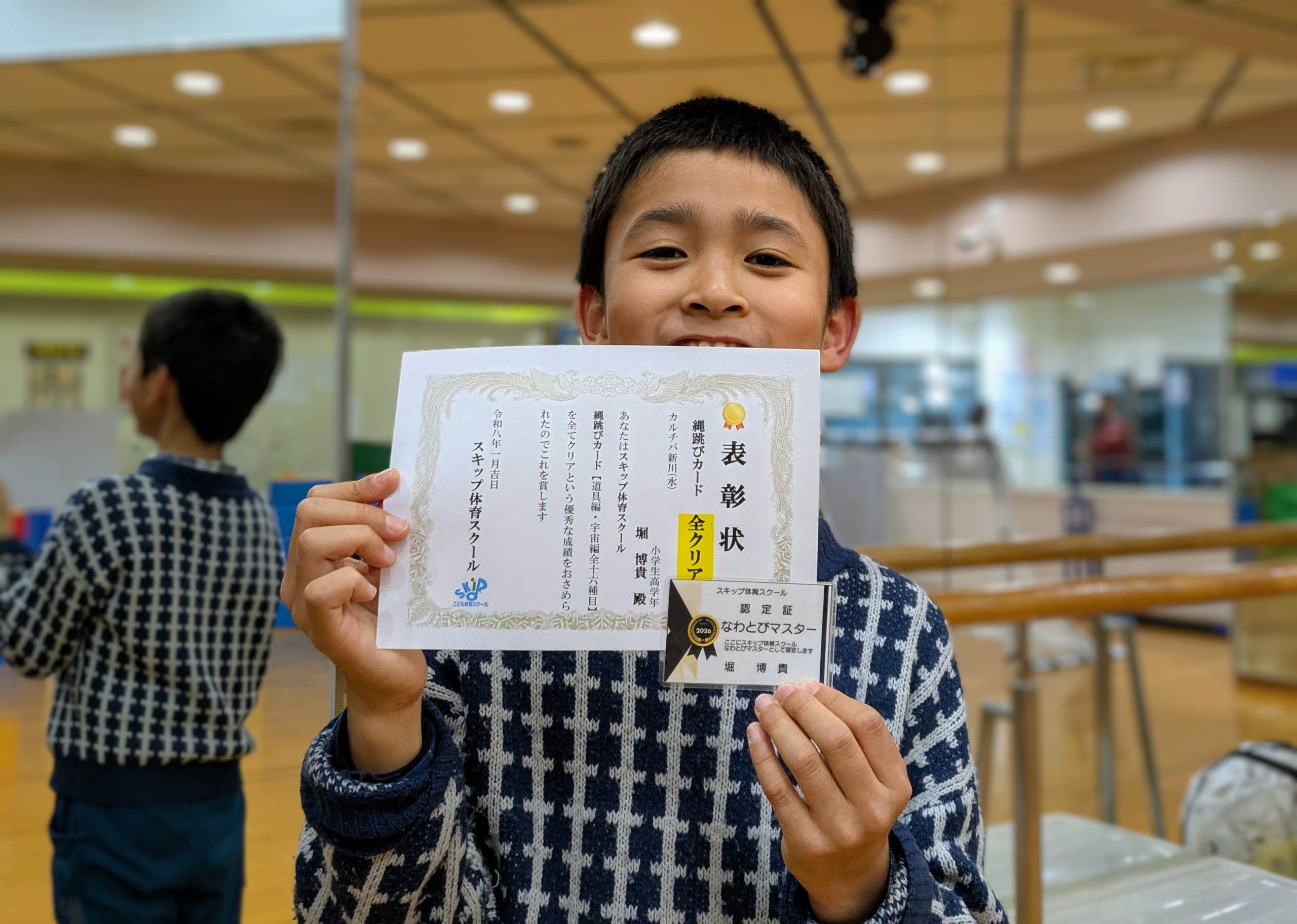 本日は、なわとびカードの種目を全てクリアしたスクール生に表彰状と、マスター認定証を贈呈いたしました🎖️